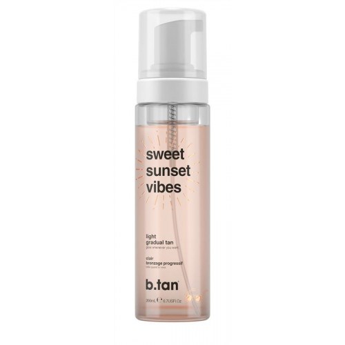 För dig som tycker om att ta det lugnt och göra små förändringar: Sweet Sunset Vibes är en brun-utan-sol som ger huden en stegvis mörkare nyans. Få en solkysst hy som ser helt naturlig ut. Gläns varje dag!Veganvänligt. Ingen äcklig brun-utan-sol-lukt. Inga parabener eller sulfater. Inga tillsatser av kemikalier. Enbart ingredienser med naturligt ursprung.AnvändningFörst och främst: klä av dig helt, eller så mycket som krävs för att använda brun-utan-sol-mousse. Var noga med att din hud är rengjord, exfolierad och torr. Applicera mousse med en b.tan applikatorvante, tvätta sedan händerna och du är klar!200 ml