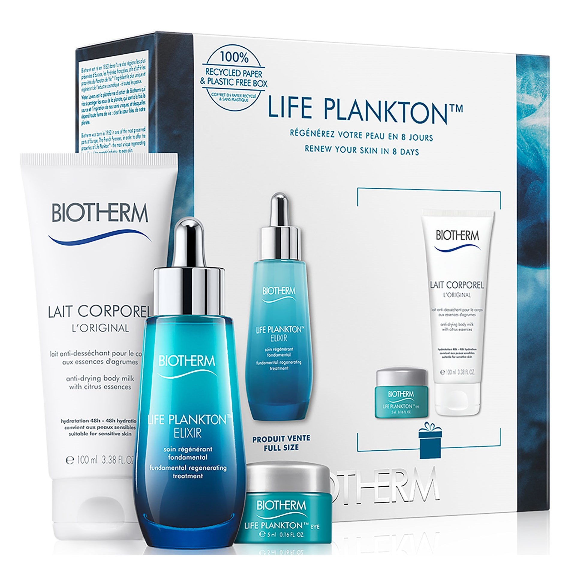 Biotherm Blue Life Plankton Elixir Set. Presentförpackning som består av:- Life Plankton Elixir 50 ml- Life Plankton Eye Cream 5 ml – Lait Corporel Body Lotion. För alla hudtyper. Biotherm Life Plankton Elixir är ett serum för alla hudtyper och åldrar, och det första steget till en vacker hud. Den innehåller 5% LIFE PLANKTON™ – Biotherms signatur ingrediens som är känd för sina regenererande egenskaper. Biotherm Life Plankton Eye är en ögonkräm som stärker ögonområdet mot dagliga aggressioner och förhindrar fina linjer samt slätar ut ögonområdet. Redan efter 8 dagar uppleves hudens kvalitet i ögatmrådet förbättrad. Biotherm Lait Corporel Body Lotion är en fräsch och återfuktande bodylotion för alla hudtyper.