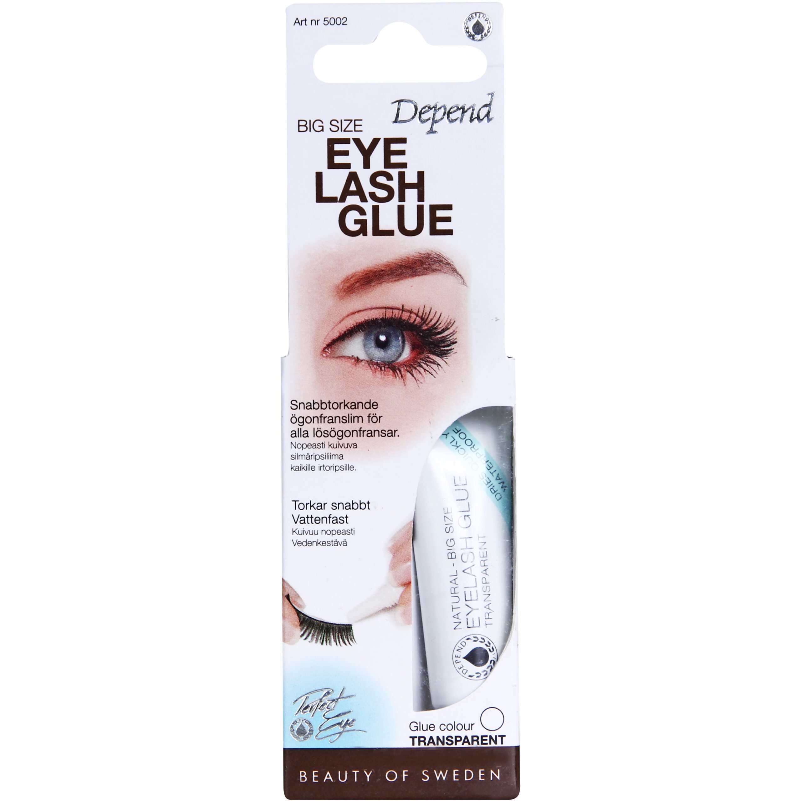Depend Eyelash Glue Natural Big Size är ett snabbtorkande och transparent lim som håller dina lösögonfransar på plats från morgon till kväll. Limmet är vattenfast, kladdar inte och fäster direkt. För enklare användning är limmet vitt vid applicering och blir transparent först när det torkar. Produkten är latexfri.Torkar snabbtVattenfast
