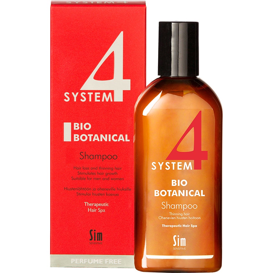 215 ml, System 4 Bio Botanical Shampoo Against Premature Hair Loss är ett milt schampo för håravfall. Rengör hårbotten effektivt från mjäll och talg. Återställer hårets och hårbottens naturliga fuktighetbalans. Lugnar inflammationer i hårbotten. Innehåller flera örtextrakt som förhindrar håravfall, samt stimulerar blodcirkulation i hårbotten.
