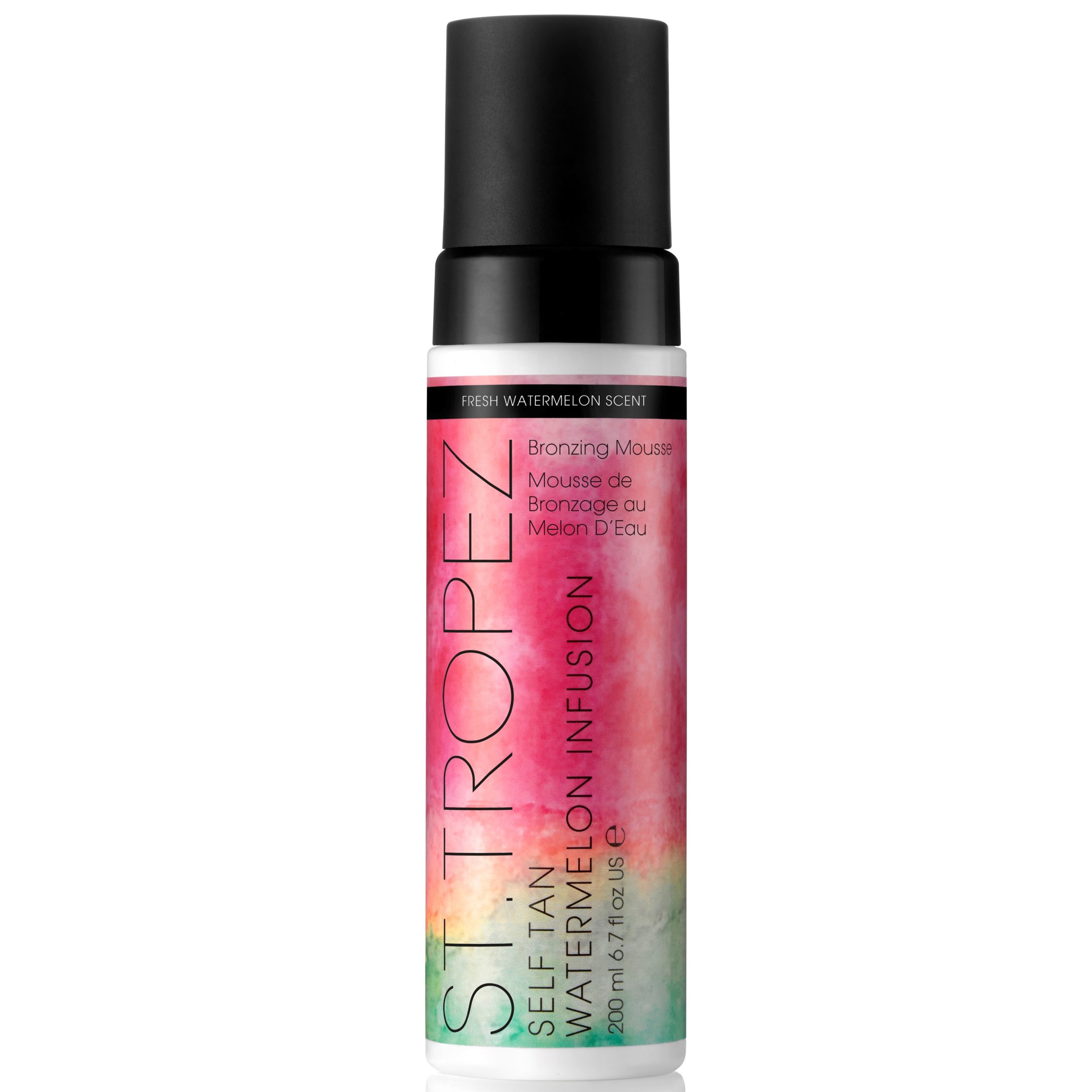 Self Tan Watermelon Infusion Bronzing Mousse är en twist på klassikern Self Tan Classic Bronzing Mousse som är St.Tropez mest sålda produkt. Self Tan Classic Bronzing Mousse är en tonad snabbtorkande mousse som ger en jämn gyllenbrun hudton utan avslöjande ränder eller fläckar. Den är enkel att applicera, vägledningsfärgen ser naturlig ut och teknologin Intelligent Tanning System gör att färgen anpassar sig till din egen hudton, varar i upp till 10 dagar och avtar jämnt. Self Tan Watermelon Infusion Bronzing Mousse ger ett lika gyllenbrunt resultat som originalet, men med extra återfuktning och hudvårdande ingredienser i form av vattenmelonextrakt och vitamin E! St.Tropez Self Tan Watermelon Infusion Bronzing Mousse har en härligt somrig doft som tilltalar sinnena men också döljer den klassiska ”BUS-lukten”, både vid applicering och under tiden då färgen utvecklas. Doften av vattenmelon återfinns i både topp- och mellannoterna. I toppnoterna även kiwi och röda bär och i mellannoterna vattenblommor och grädde. Doften rundas av med toner av söt pudrig mysk. 200 ml