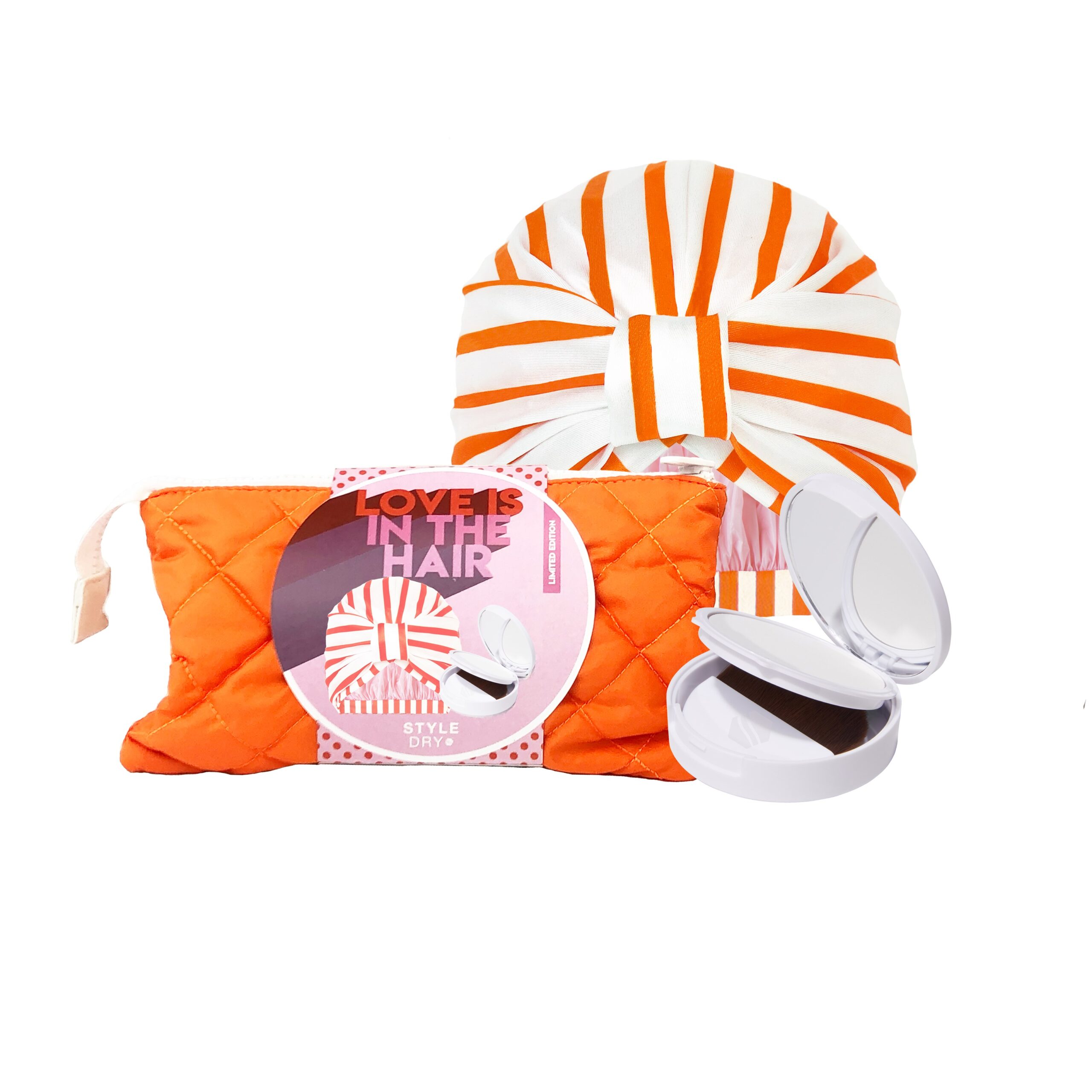 Setet innehåller det innovativa StyleDry Original Dry Schampo Compact Powder torrschampoot som doftar sött av apelsinblomma samt limited edition StyleDry Stripe Me Tender duschturbanen med en dubbelsidig, vändbar väska som är orange på den ena sidan och rosa på den andra. Känner du att det är dags för någonting nytt kan du helt enkelt vända väskan ut och in för en helt ny look!