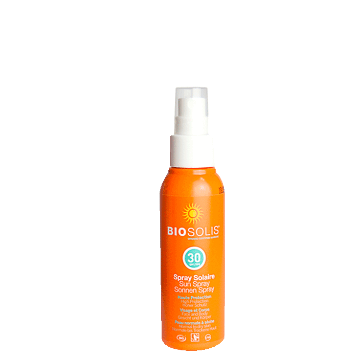 Solskyddsspray från Biosolis med SPF30 som absorberas snabbt och lämnar huden utan att kännas klibbig.