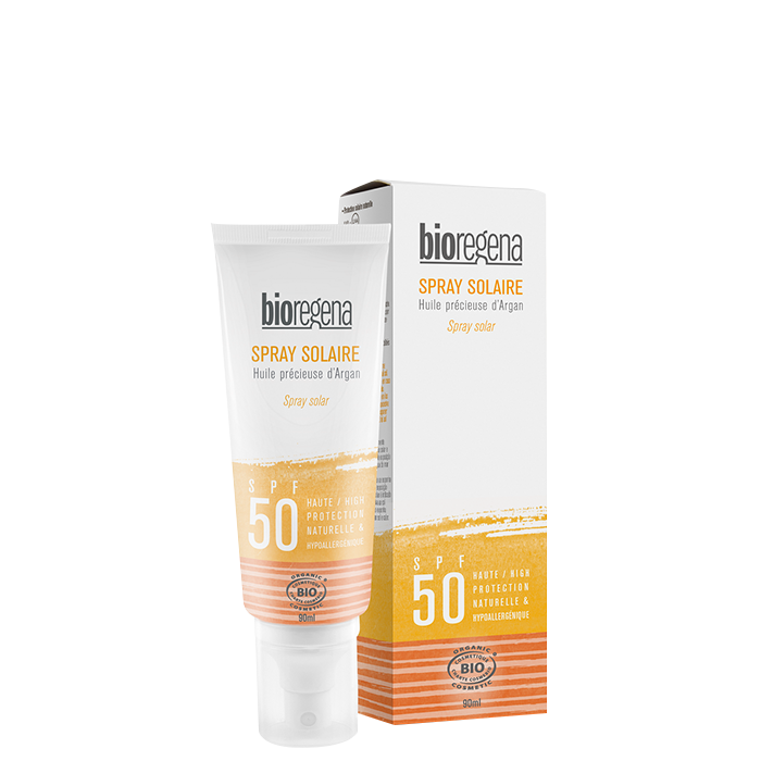 Ekologisk solskyddslotion SPF 50 med sprayfunktion från Bioregena som ger ett högt skydd och passar alla hudtyper, även den mycket känsliga huden.